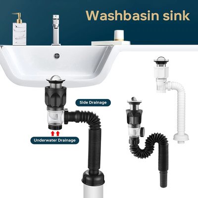 Εύκαμπτο πλαστικό σιφώνι, με βαλβίδα από χαλκό και καπάκι με μηχανισμό pop up, κατάλληλο για νιπτήρες μπάνιου ή κουζίνας. Εξοπλίζεται με δοχείο stopper το οποίο είναι σχεδιασμένο να συγκρατεί τις τρίχες, αποτρέποντας το φράξιμο του σωλήνα, ενώ, διαθέτει και 2 εξόδους διοχέτευσης του νερού (προς τα κάτω & προς το πλάι) για την ιδανική τοποθέτηση σύμφωνα με την διαρρύθμιση του χώρου σας.
