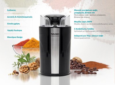 O μύλος άλεσης της Bruno είναι ιδανικός για την άλεση κόκκων καφέ, φρέσκων μπαχαρικών, βοτάνων και σπόρων. Εξοπλίζεται με ισχυρό μοτέρ 200W και δοχείο και λεπίδες από ανοξείδωτο ατσάλι υψηλής αντοχής.