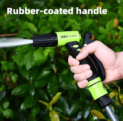 Πιστόλι εκτόξευσης νερού της Deli με 3 λειτουργίες ψεκασμού. Διαθέτει αντιολισθητική λαβή που εφαρμόζει καλά στο χέρι για πιο ξεκούραστο πότισμα.
