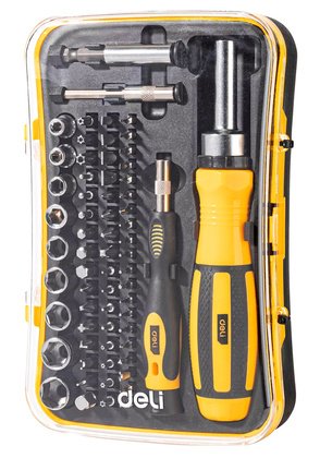 Σετ κατσαβιδιών ακριβείας της Deli το οποίο αποτελείται από 2 κατσαβίδια, 2 επεκτάσεις και 61 διαφορετικές κεφαλές και εξαρτήματα κατσαβιδιού.