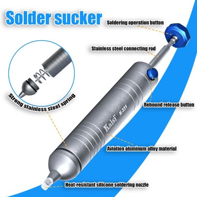 Το desoldering pump της Kaisi επιτρέπει τον εύκολο καθαρισμό της περίσσειας συγκόλλησης σε πλακέτες. Αποτελεί ένα απαραίτητο εργαλείο για εργασίες επισκευής και αποσυναρμολόγησης εξαρτημάτων.