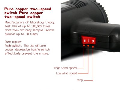 Πιστόλι θερμού αέρα με 2 ταχύτητες, με ρυθμιζόμενη θερμοκρασία 50-400 °C για την χαμηλή ταχύτητα και 50-600 °C για την υψηλή ταχύτητα.