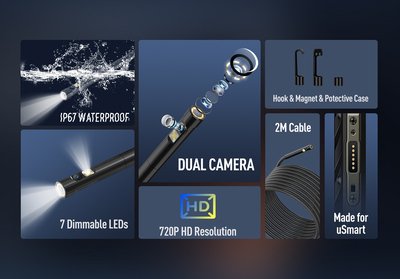 Είναι εξαιρετική για προβολή εικόνας σε μέρη που είναι δύσκολα προσβάσιμα, όπως για παράδειγμα εντός σωληνώσεων, συστημάτων εξαερισμού κλπ. Διαθέτει μια μπροστινή και μια πλαϊνή κάμερα, 7 ρυθμιζόμενα LED και μπορεί να συνδεθεί ενσύρματα με smartphone της Ulefone που διαθέτουν uSmart βύσμα επέκτασης.