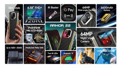 ULEFONE smartphone Armor 22, 6.58″, 8/256GB, 6600mAh, IP68/IP69K, μαύρο