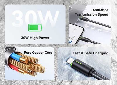 Καλώδιο φόρτισης και μεταφοράς δεδομένων Lightning σε USB-C της Usams. Υποστηρίζει φόρτιση με απόδοση έως 30W και μεταφορά δεδομένων με ταχύτητα έως 480Mbps.