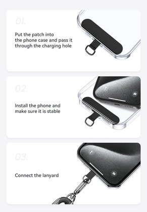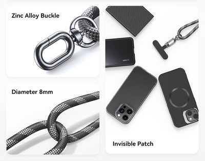 Είναι ρυθμιζόμενο και αποτελείται από 2 μέρη, το κορδόνι και ένα υφασμάτινο κομμάτι το οποίο τοποθετείται στο εσωτερικό της θήκης του κινητού, επιτρέποντας το κρέμασμα του από τον γάντζο του κορδονιού.