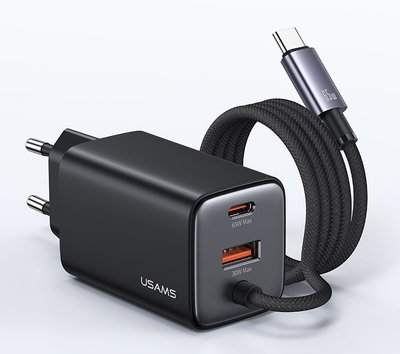 USAMS φορτιστής τοίχου CC266 με καλώδιο, USB & USB-C, 65W, GaN, μαύρος